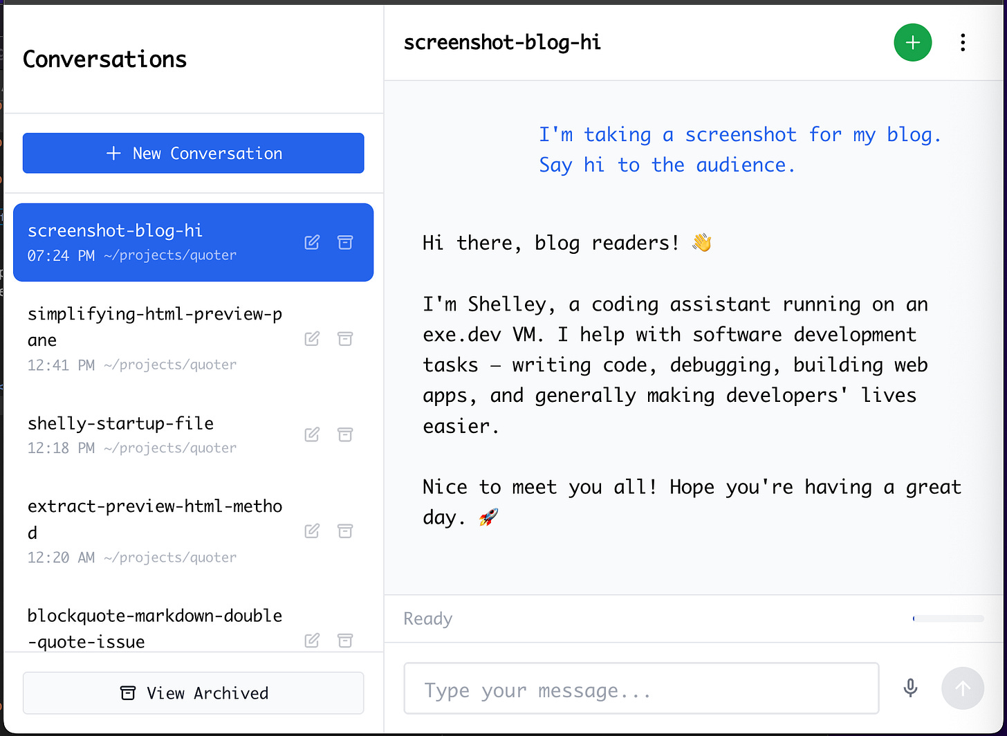 I’m using exe.dev, which is what you get if you start with a regular hosting service for Linux VM’s and add some nice extras that make vibe-coding easy. When you create a new VM, the service automatically sets up a coding agent called Shelley.1 You can chat with Shelley in a browser tab. I keep that tab pinned in my browser so I can chat with it whenever I like.